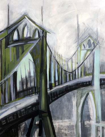 Stop by the month of October for a look at Mel's bold colorful bridges and urban scenes. Works are oil & acrylic on canvas and mixed media on paper. All of the bridges represented are full of line work, color and perspective. She has explored the urban scene with her continued love of the figure. Mel's work is inspired by the expressionist movement, with each stroke and color, the emotion of the subject is intensified.