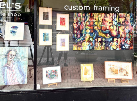 This month we're showing off shop owner Mel Townsend's expressive oil and acrylic painting, featuring energetic rich color, sharp lines and striking figures. Assistant framer Jaxun Doten who's beautiful and meticulously rendered ink works on paper will leave you stunned. And in house designer Ona Pitschka's digital illustrations featuring bold colors and medieval inspired figures. Come in and check us out!